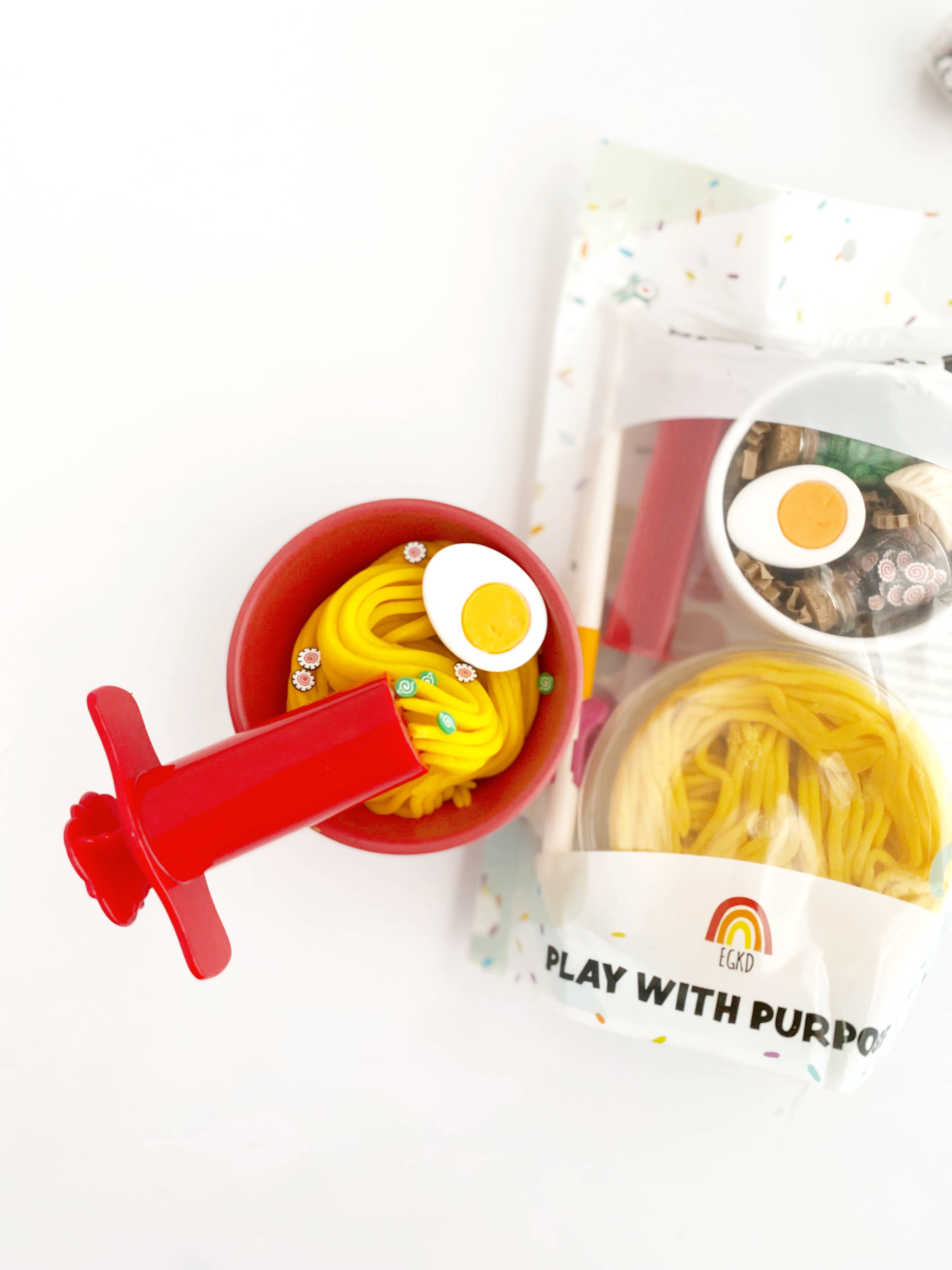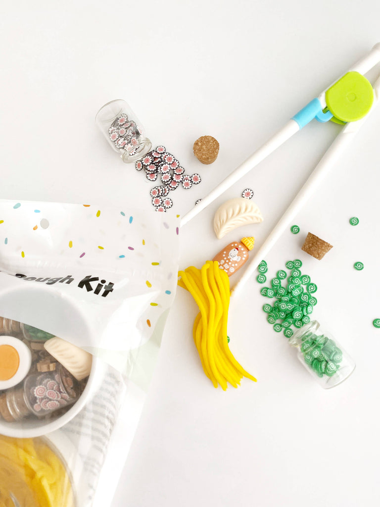 Includes 8 Ounce jar Yuzu Citrus KidDough, Melamine bowl, noodle extruder, chopsticks with chopstick trainer, dumpling charm, egg charm, chili sauce charm, green onion fimo, and fish cake fimo.
