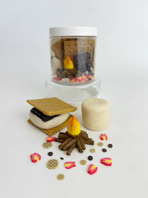 Includes: 4 ounces White (Marshmallow) KidDough Faux Graham Crackers and Chocolate Bar, S'mores Fimos and Campfire.