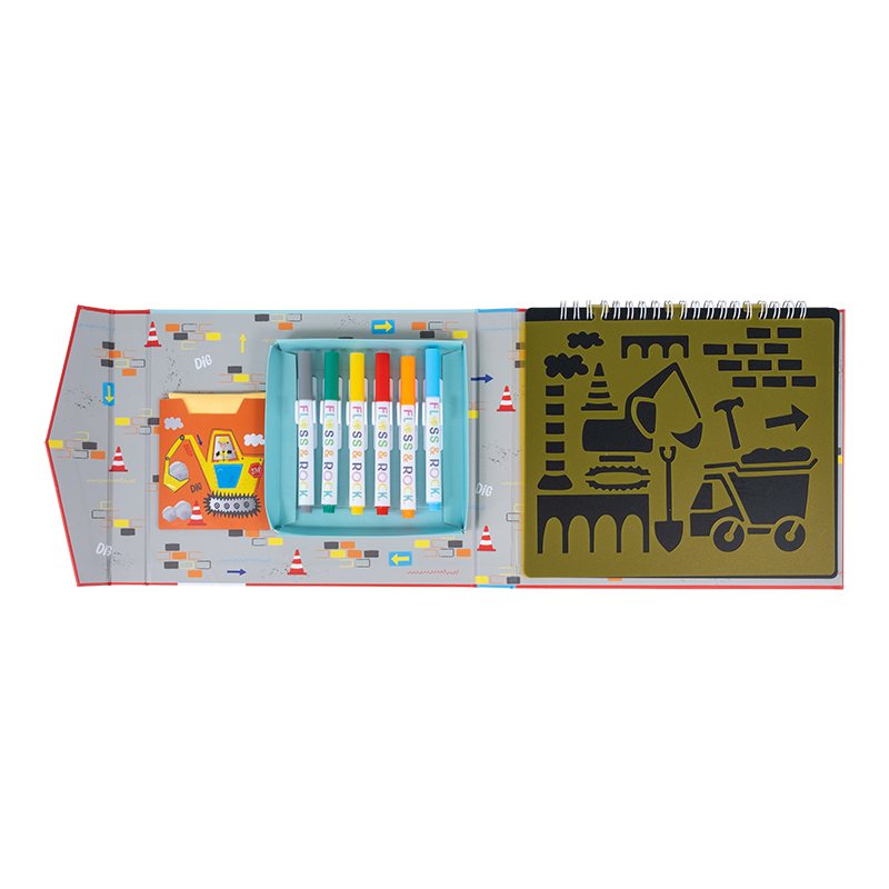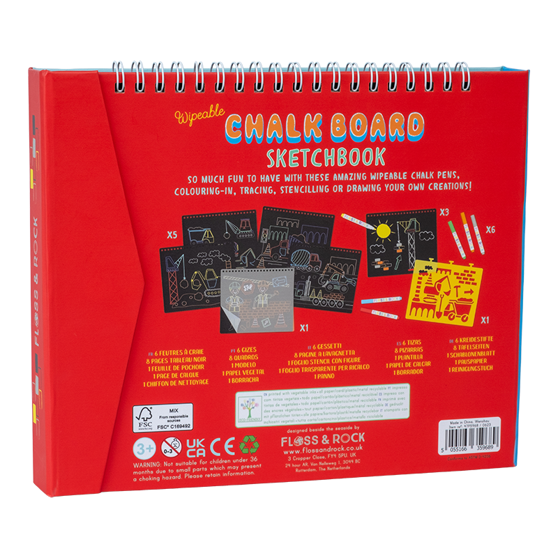 Chalk board fun in a wipeable sketchbook format! This brilliant Construction Chalk Board Sketchbook contains 8 pages. 5 pages with ready to colour-in illustrations featuring builders, diggers, trucks and more, plus 3 plain pages ready for freestyle doodling! There's also a tracing sheet and a super, Construction themed stencil sheet. Both these sheets can be removed and clipped into the spiral book bind whereever you choose! The sketchbook comes with 6 coloured chalk pens and a handy cleaning cloth to wipe the pages clean when you're finished, ready to start again and continue with your creativity next time! The pages are printed with vegetable inks and all of the paper, card, plastic and metal contents are recyclable.