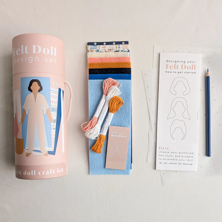 This new felt doll craft kit is a fun introduction to fashion design and pattern making! A fashion-forward take on a vintage paper doll craft; each Design Set includes complete instructions, a pre-cut felt doll, choose-your-own hairstyle (3), clothing patterns, drafting material, chalk pencil, felt fabric swatches (9), and embroidery floss + needles.