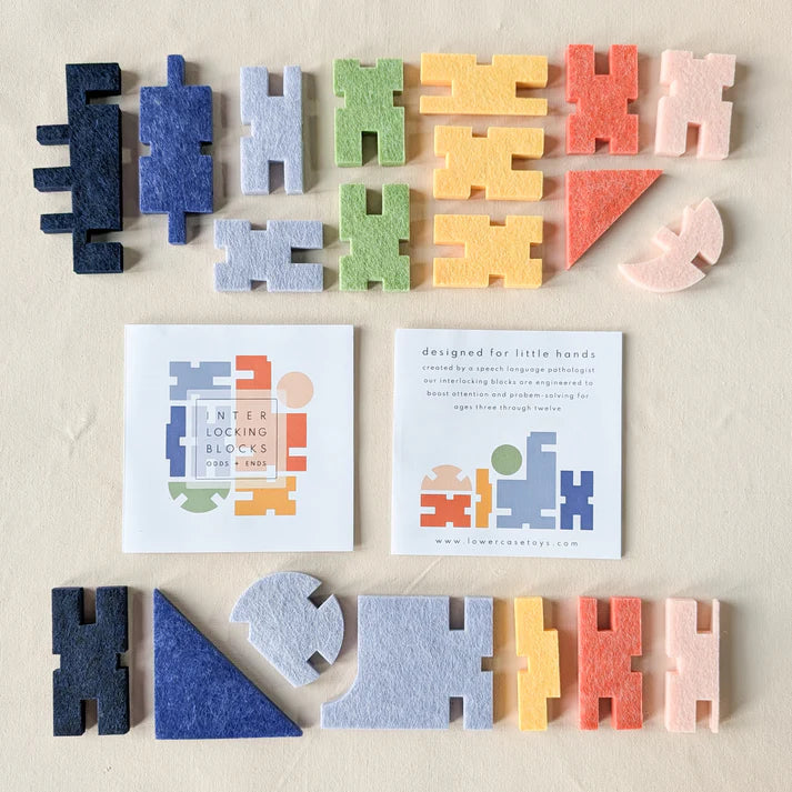 Our interlocking block line features innovative notched connections that encourage creative problem-solving and geometric exploration. Made out of recycled water bottles, our durable + washable Odds + Ends Set fosters creative problem-solving and collaborative play.