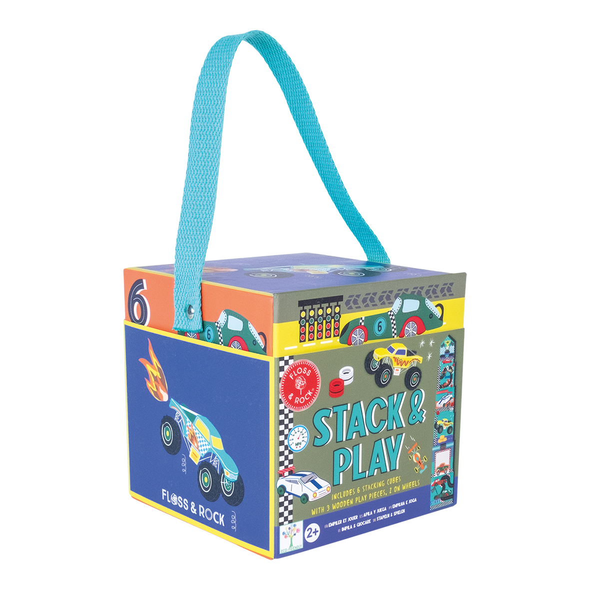 Get ready for endless amounts of fun with Stack & Play. Make a tower, then hide and play using the wooden pieces. Count the numbers on one side, then match up the scenes on the other (either by stacking or laying them side by side). This WHEEL-y cool Cars design features monster trucks, motorbikes and racing cars. Stack & Play includes 6 stacking cubes, 3 wooden play pieces, 2 on wheels. All parts are stored in the biggest box with a handy carry handle, making it so easy to take around with you!