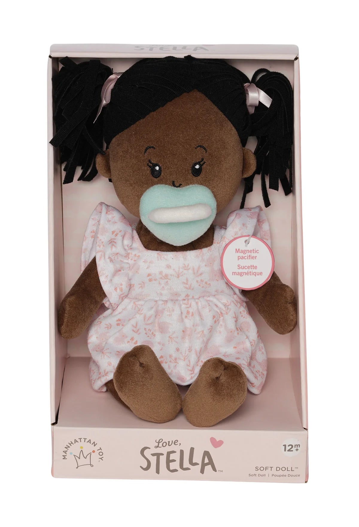 The Love, Stella dolls are the perfect size for holding, hugging, and nurturing role play to foster social and emotional development. Dolls are 100% soft with embroidered features, fabric hair, plump tummies, cute little belly buttons, and a signature magnetic pacifier design. The doll body has a weighted bottom and sits unassisted - perfect for playtime! Clothes and diaper are removable and feature hook-and-loop closures for supporting elementary dressing skills.
