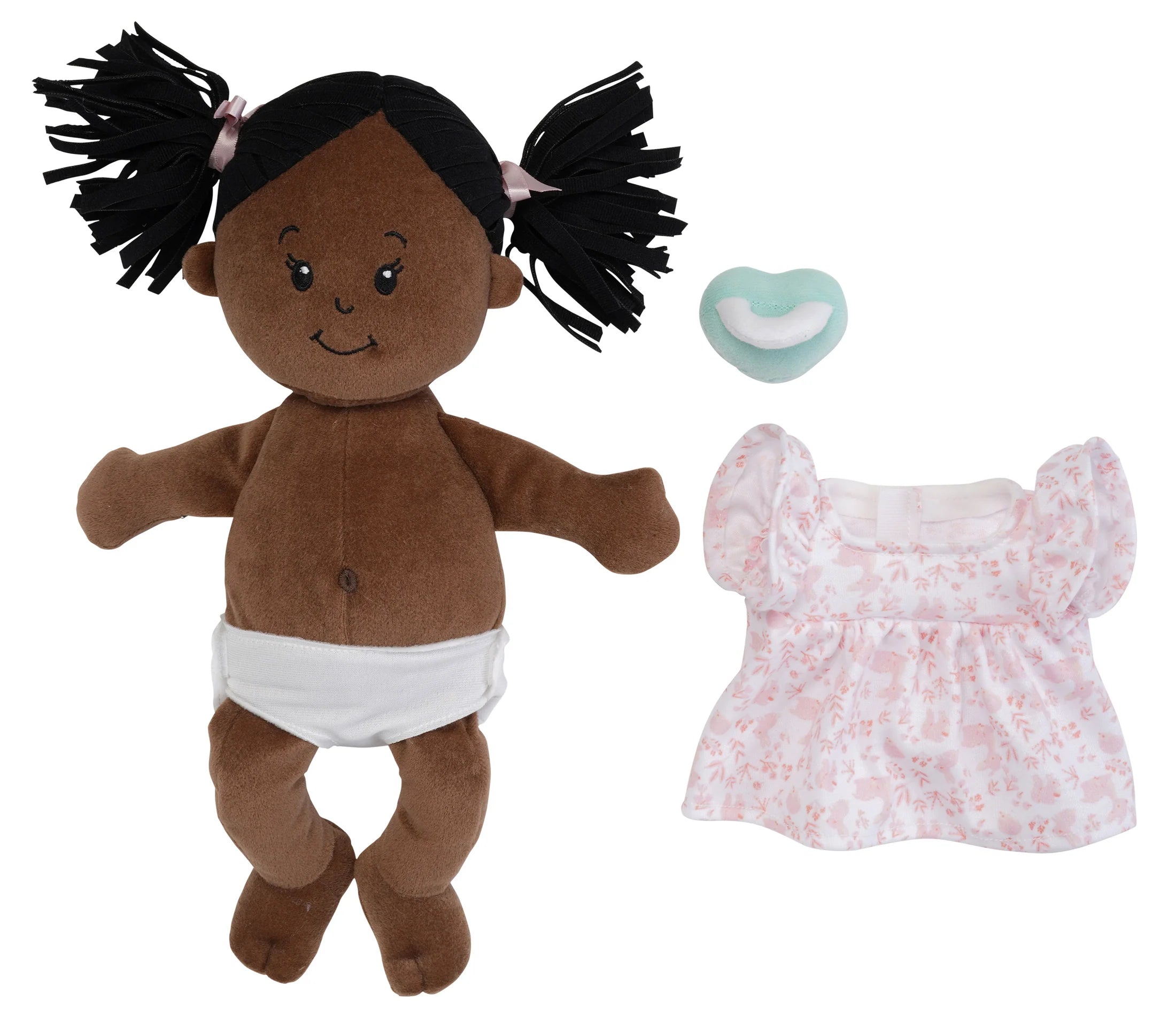 Toddler must-have! 100% soft doll with embroidered features, fabric hair, plump tummy, bitty belly button, a magnetic pacifier, and sittable design.